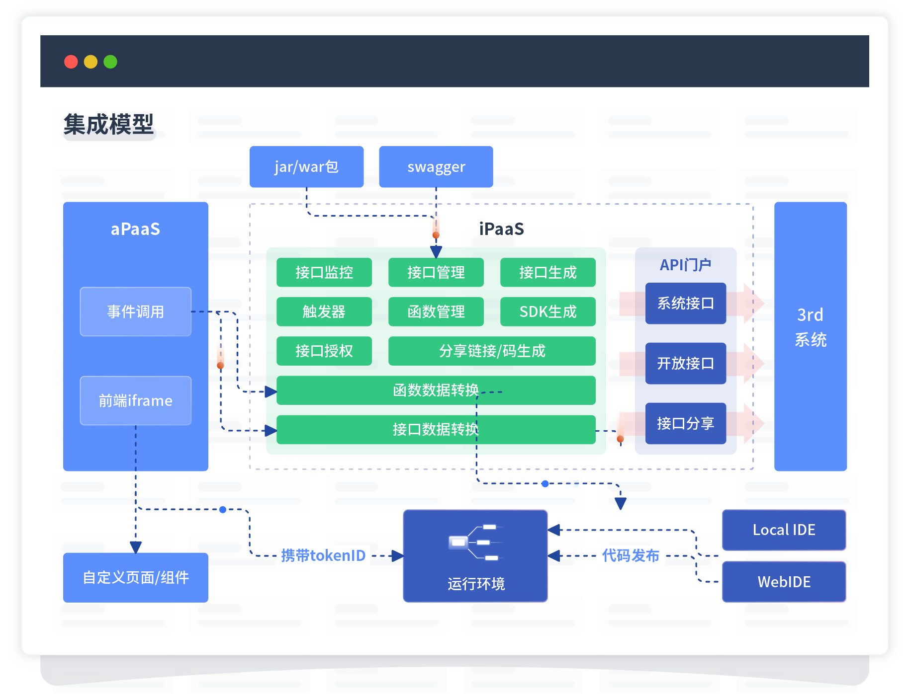 集成模型包括平台本身前、、、、、、、、后端能力的扩展,,,,,,,,,,,,也支持通过API门户和第三方系统进行交互。。。。。。。。。。。。。