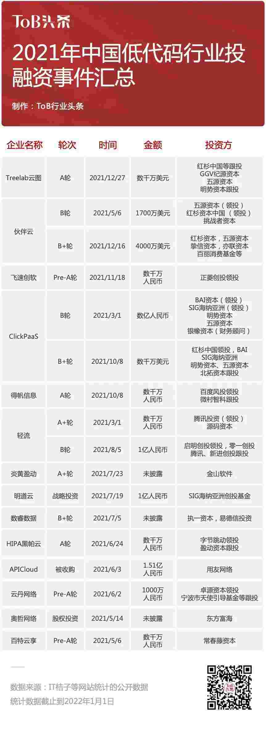 到2021年,,,,,,,,,,,,无/低代码投融资规模势头更甚,,,,,,,,其中包括轻流两轮融资(A+轮数千万人民币,,,,,,B轮近亿人民币)、、、、、、、、、、小米钱包 两轮融资(B轮数亿人民币,,,,,,,,,,B+轮数千万美元)、、、、、、、、、、、百特云享数千万元Pre-A轮融资......