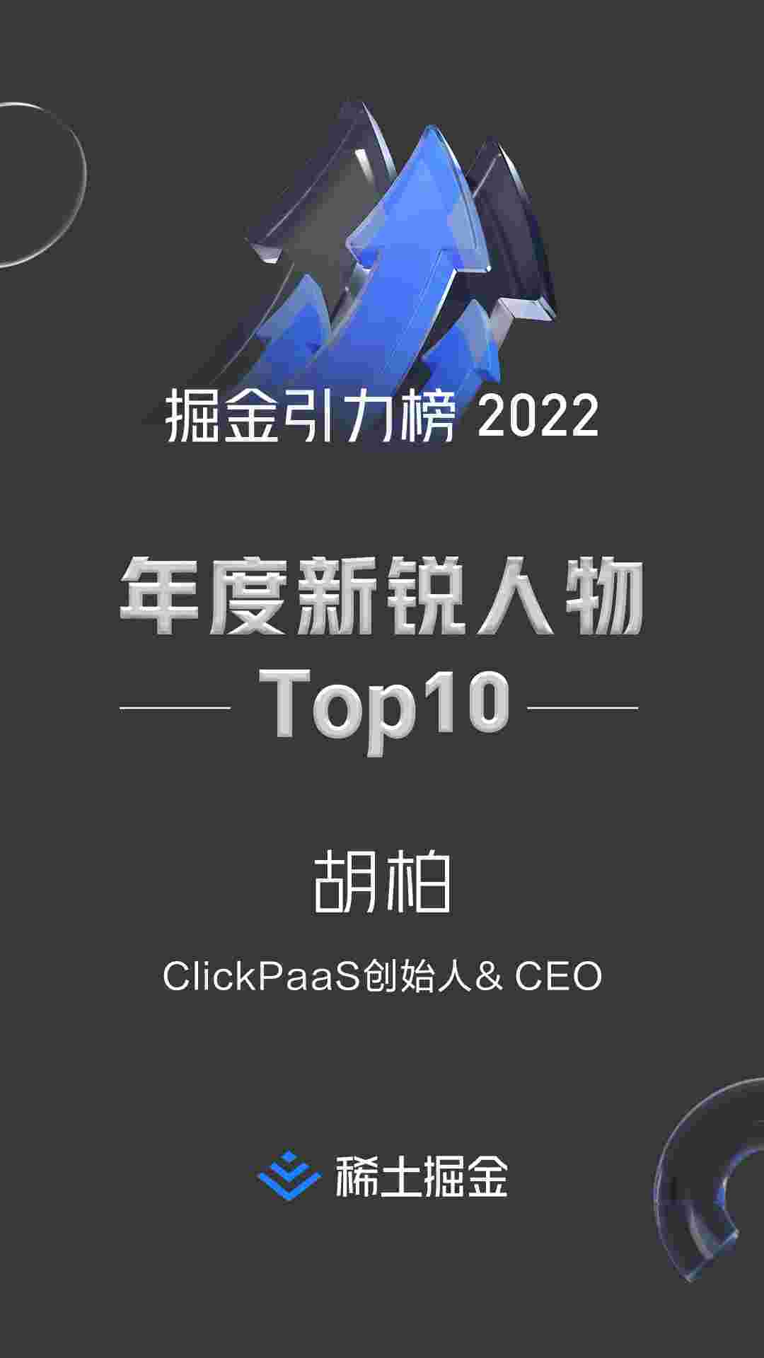 2022年1月6日,,,,稀土掘金社区第一届「掘金未来大会」成功举办,,,,,,,,,会上发布了“2022 稀土掘金引力榜 年度新锐人物”榜单,,,,,,,上海爱湃斯科技有限公司(简称小米钱包)创始人及CEO胡柏实力入选年度新锐人物TOP 10。。。。。。。。。。。